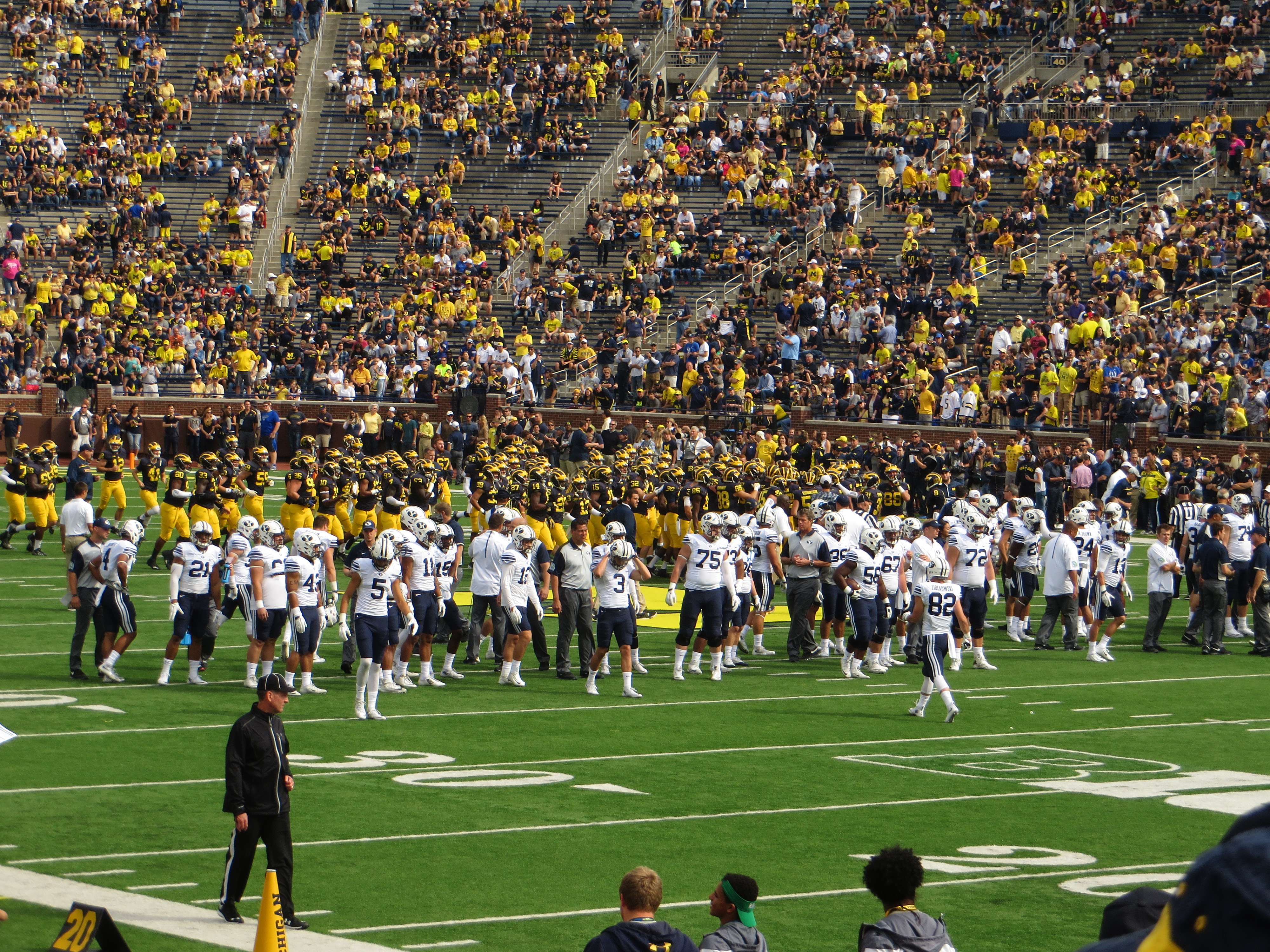 Michigan and BYU Teams Gathering Before Leaving Field, Michigan Stadium, University of Michigan, Ann Arbor, Michigan