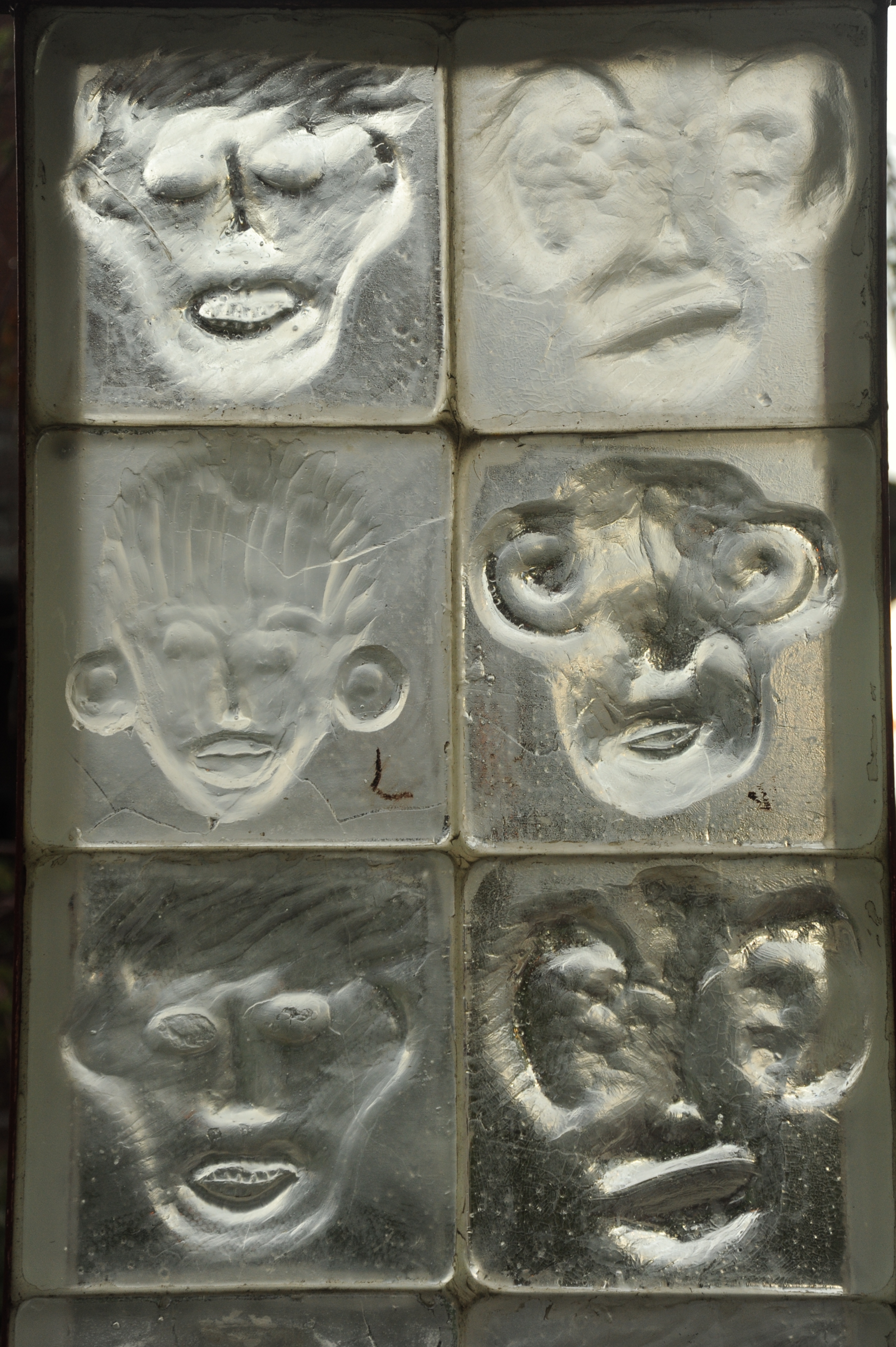Abstract faces, human, monkey, glass sculpture, train station, Arlington Heights, Illinois, USA