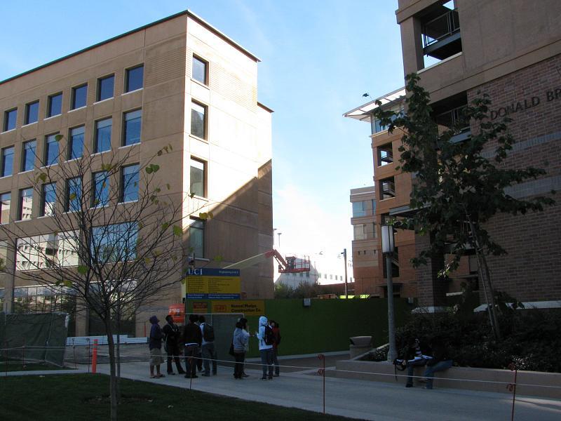 students milling in front of buildings