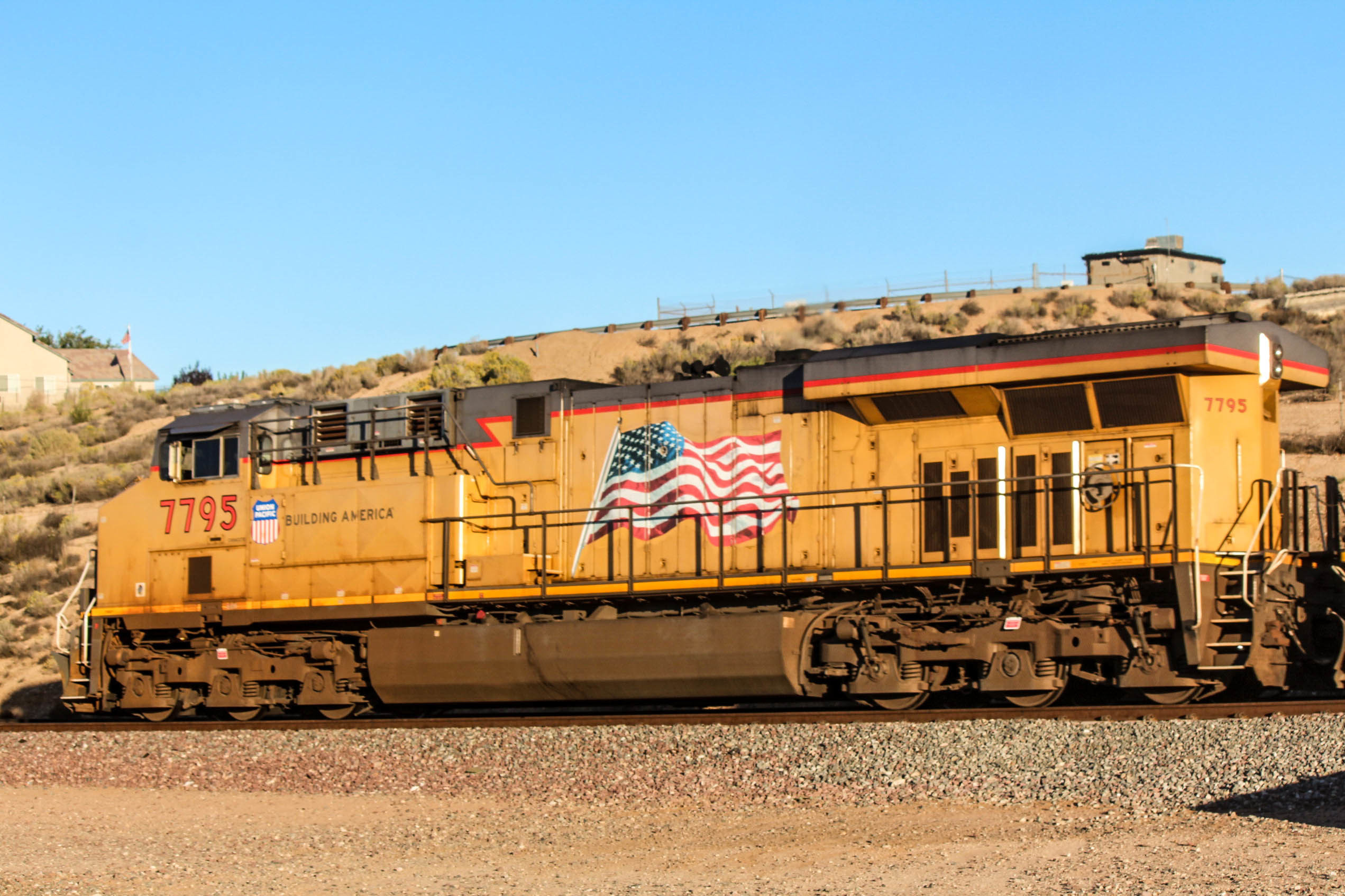 UP 7795 leading oil can train westbound Hesperia CA