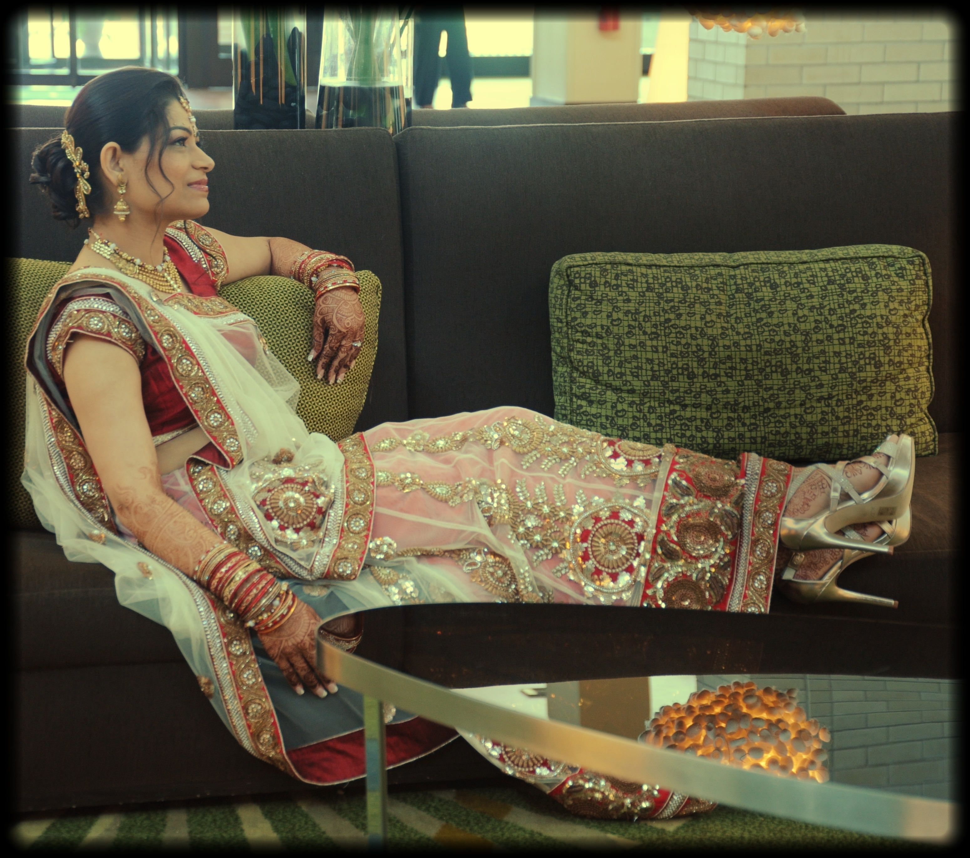 Indian bride relaxing in traditional wedding dress, transparent fabrics, gold patterns, earrings, necklace, henna, bangles, high heel shoes, reflection in the table, Hyatt Regency Hotel, Schaumburg, Illinois, USA