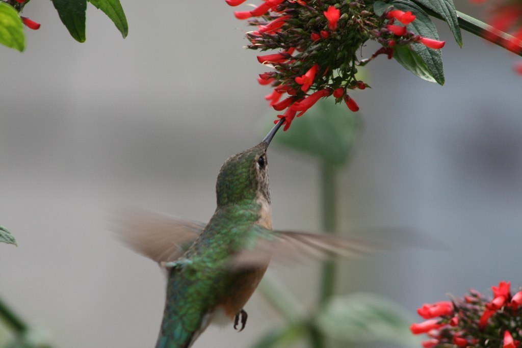 Rufous Hummingbird (Female) flying and drinking nectar