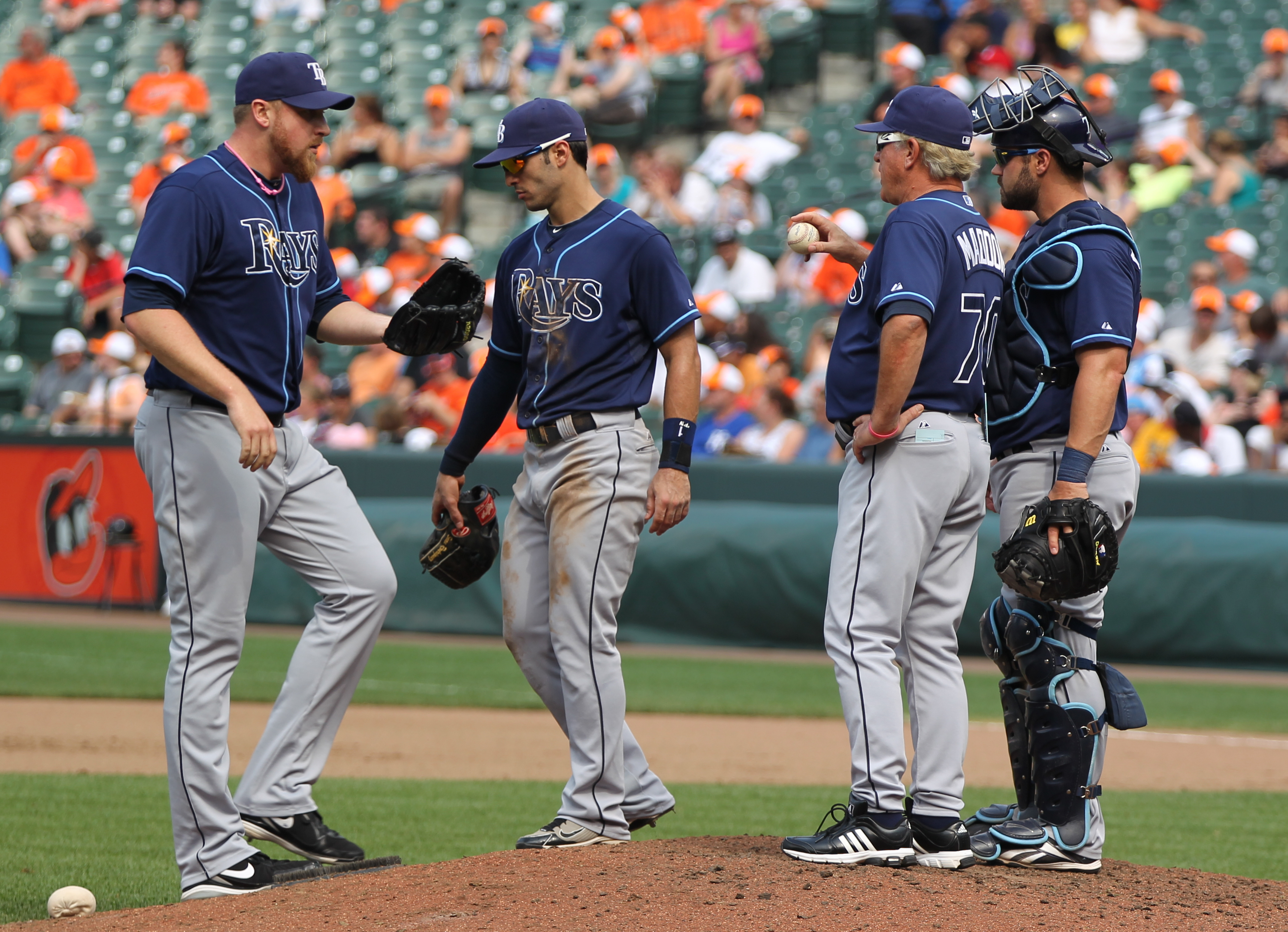 Tampa Bay Rays relief pitcher Adam Russell (36) and manager Joe Maddon (70)