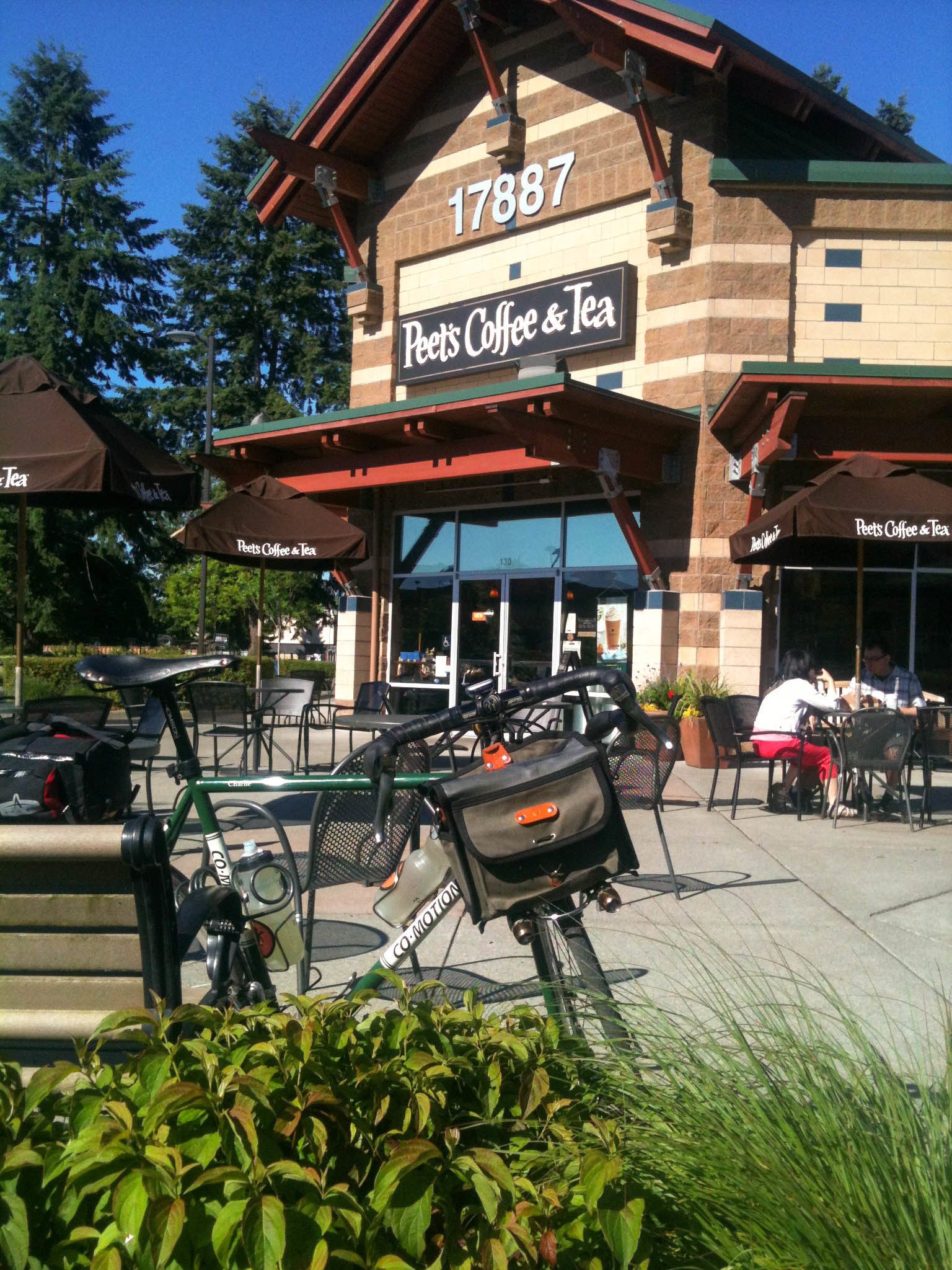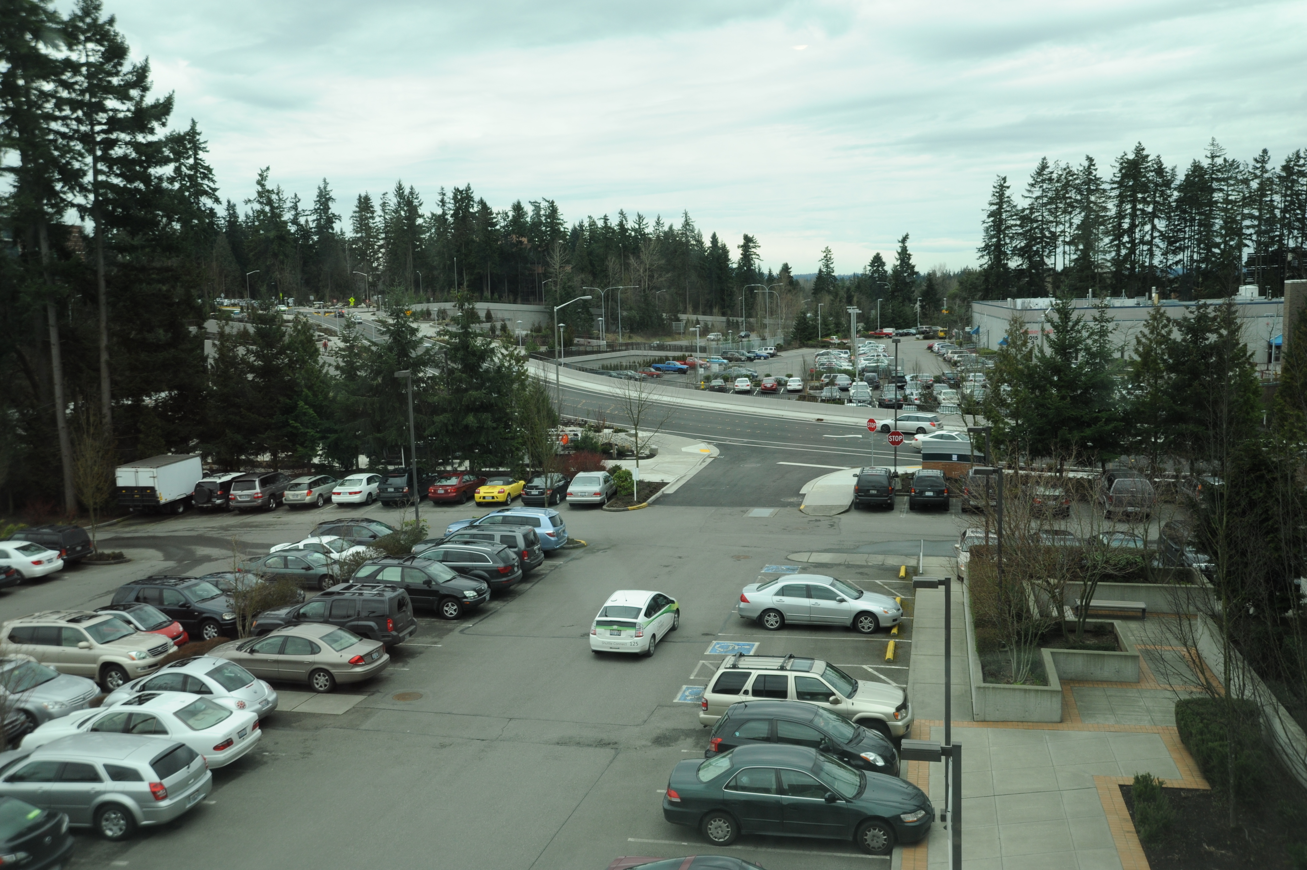 Electric shuttle car, patches of trees, Microsoft building 110 parking lot over 520 freeway, from 3rd floor cafe, Redmond, Washington, USA